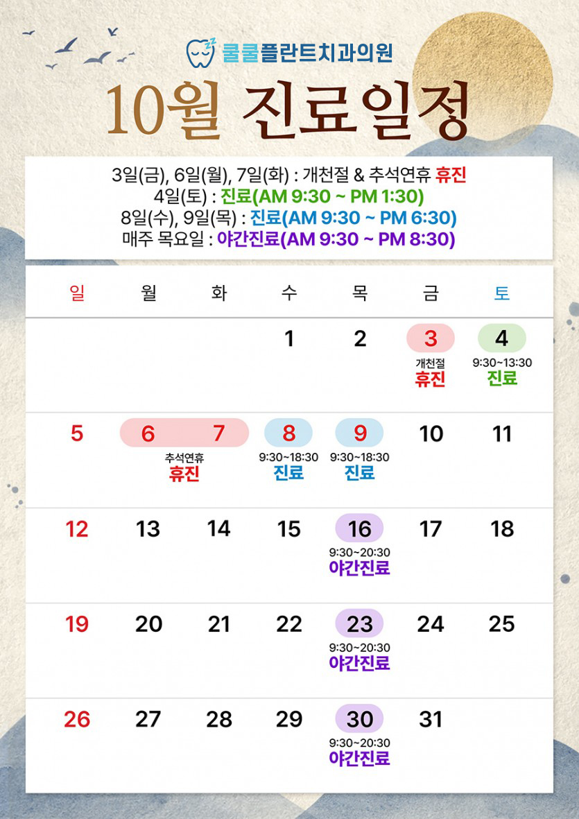 안녕하세요, 쿨쿨플란트치과입니다. 10월 진료일정 안내드립니다.