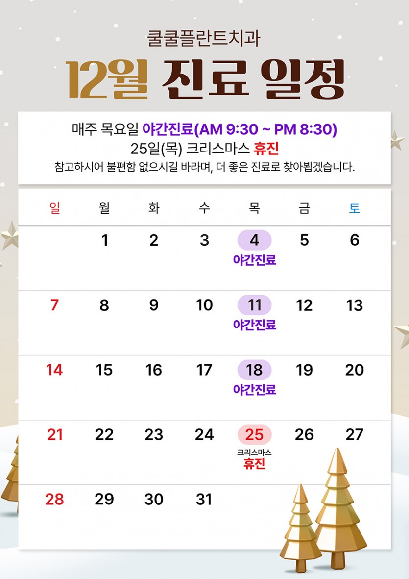 안녕하세요, 쿨쿨플란트치과입니다. 12월 진료일정 안내드립니다.