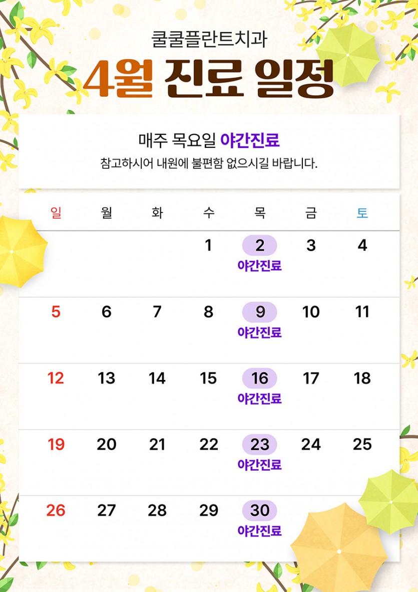 매주 목요일 : 야간진료(AM 09:30 - PM 08:30)