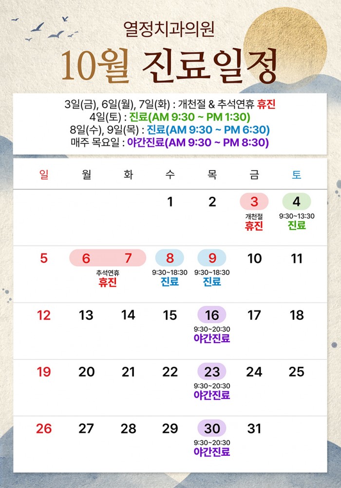 안녕하세요, 열정치과입니다. 10월 진료일정 안내드립니다.