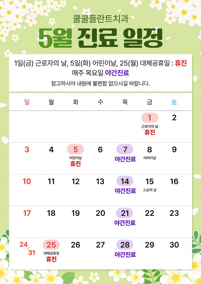 1일(금) 근로자의 날, 5일(화) 어린이날, 25일(월) 대체공휴일 : 휴진
